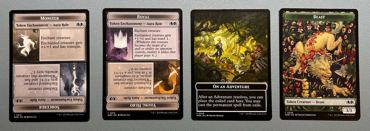 Další překvapení byly nové typy karet, jako jsou sagy, planeswalkeři a plane karty, nicméně nejvíc mě vystřelila z pantoflů masivní přehršel tokenů. Ať už to byly artefakty typu food, treasure nebo clue. Hlavně ve WOE každá druhá karta přiřazuje nějakou roli (young hero, wicked, monster…) a to přidávalo do hry úplně nové možnosti a strategie.